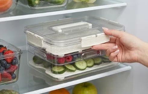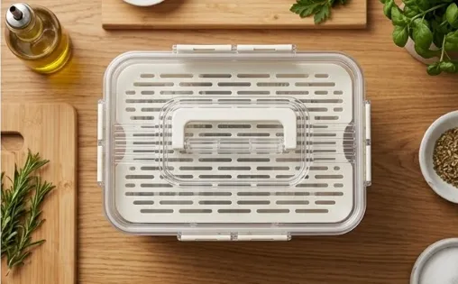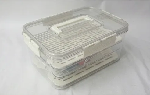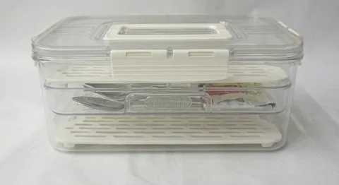 Contenedor acrílico de alimentos con tapa , asa y bandeja escurridora 31*23.8*6.8CM