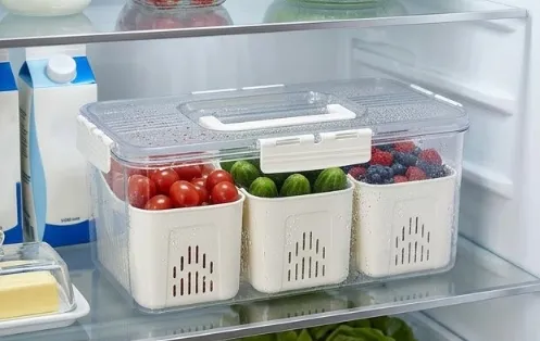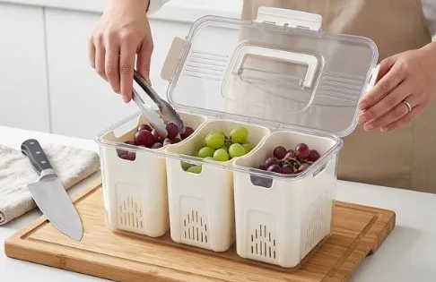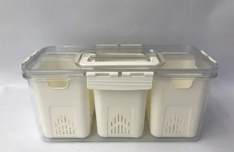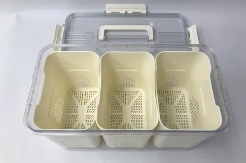 Contenedor acrílico de alimentos con tapa , asa y cesta de 3 compartimentos 34.2*17*13.3CM