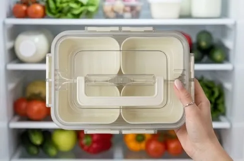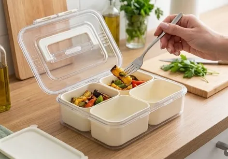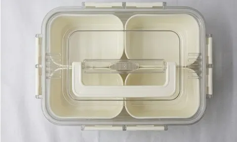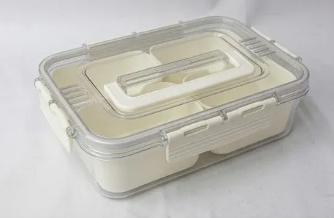 Contenedor acrílico de alimentos con tapa , asa y cesta de 4 compartimentos 23.8*17*6.8CM