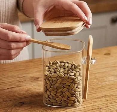 frasco de almacenamiento cuadrado con tapa y una cuchara de bambú 10*20CM