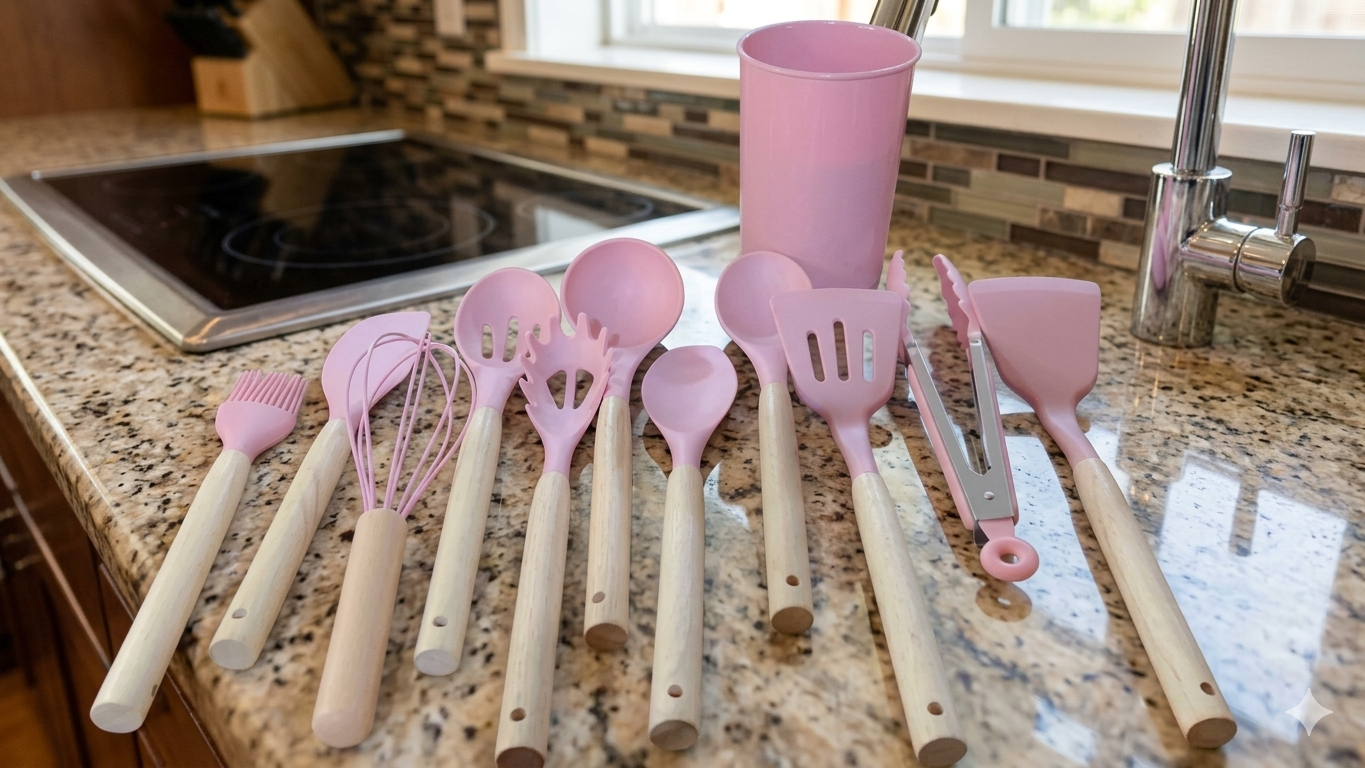 set de utensilios de cocina de silicona con mango de madera 700 grams
