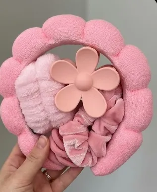 vincha elástica para skincare con un diseño de orejas de conejo y una flor amarilla